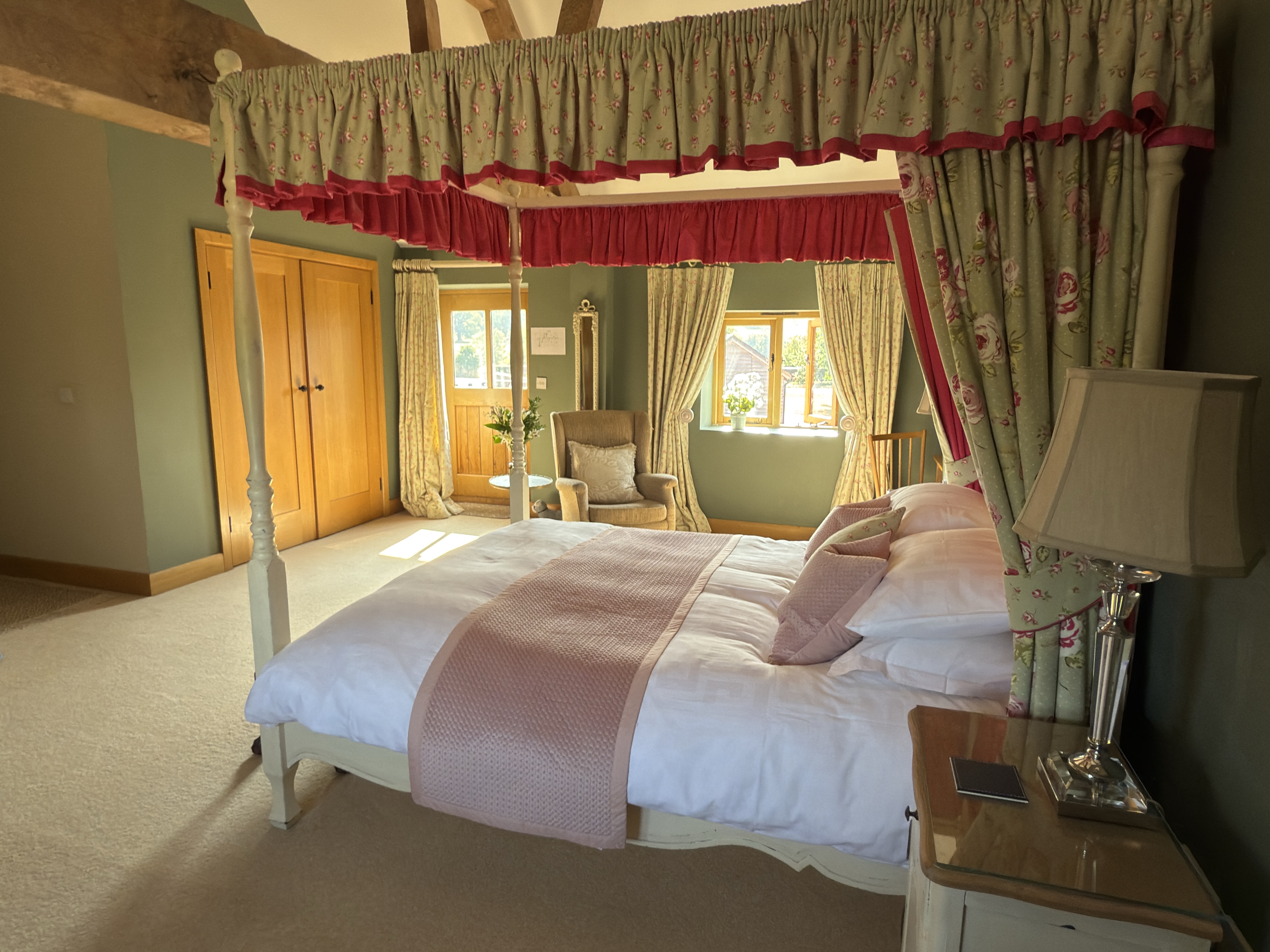 All options include a traditional four-poster bed, positioned to look out across the surrounding countryside, where mornings begin with birdsong and shifting light over the fields. The suite includes the second room, offering a comfortable seating area with a sofa bed and, or a simple kitchenette, including a small fridge, microwave, toaster, and tea- and coffee-making facilities — everything needed for easy, unhurried living. A modern bathroom with both a bath and a walk-in shower completes the space, offering the choice of a long soak or a refreshing start to the day.